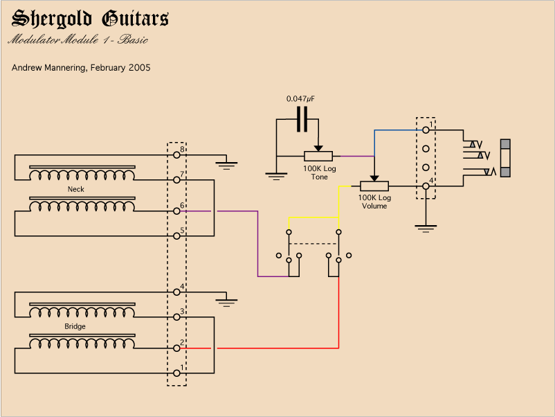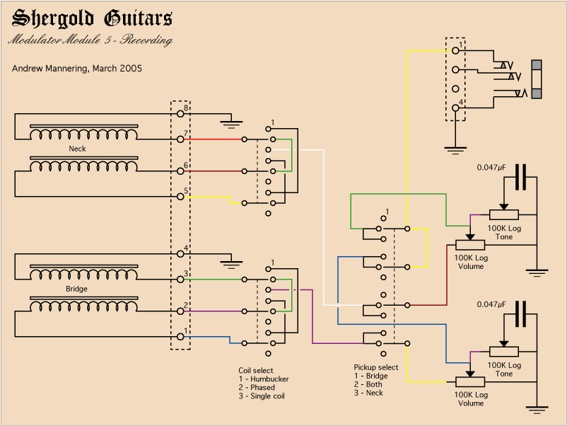 - Three way Bridge pickup coil switch: single coil, humbucker out-of-phase, humbucker in-phase